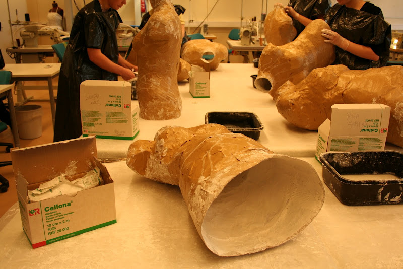 Tämän kevään valinnaiskurssiksi valitsin mielenkiintoisen sovitusnukkekurssin, jossa siis tehdään omasta kropasta täysin käyttökelpoinen ja asiallinen sovitusnukke. Tietenkin siinä vähän muodot muuttuu ja tulee senttejä lisää, mutta onpahan kasvunvaraa ainakin joissain kohti kroppaa. Suurinpiirtein siitä kuitenkin tunnistaa itsensä. On ollut kummallista kokoajan halia ja käännellä ja tarkastella omaa torsoaan. Monta mukavaa työvaihetta projekti vaatii, mutta mikään niistä ei ollutkaan ylivoimaisen hankala tai pitkä. Ensin kaverit teippasivat vartaloni liimateipillä, joka sittemmin pois riisumisen jälkeen kovettui, ja kovetettiin vielä kahdella lakkakerroksella.